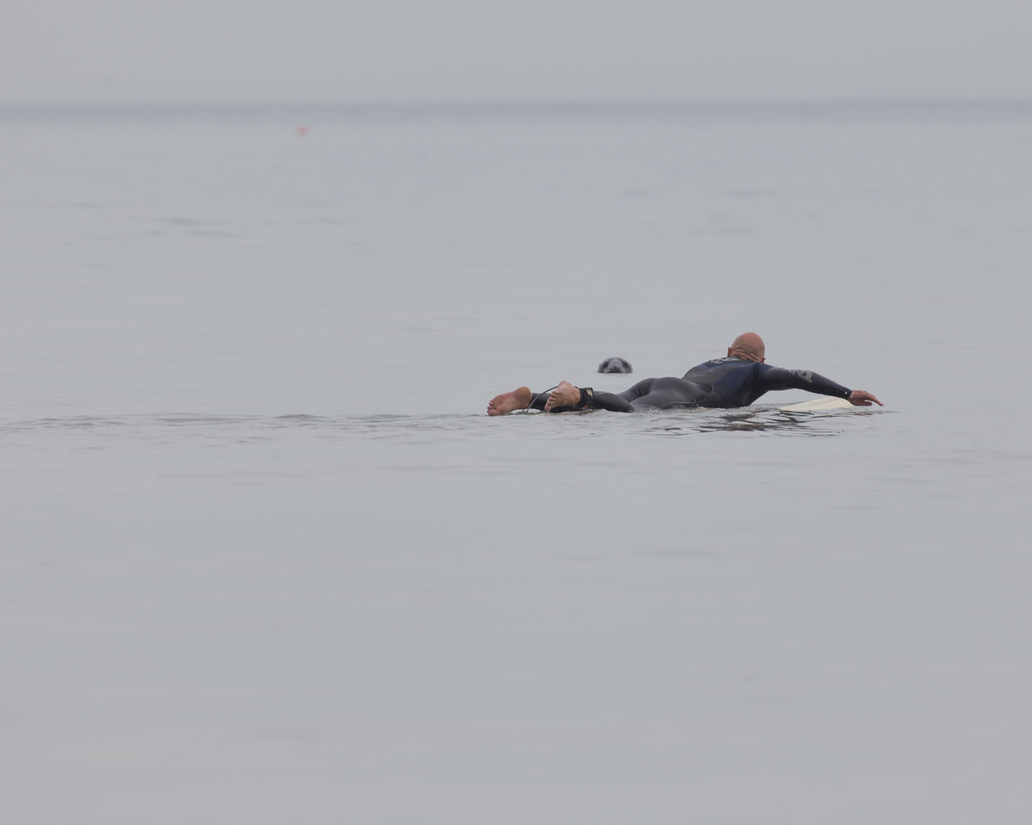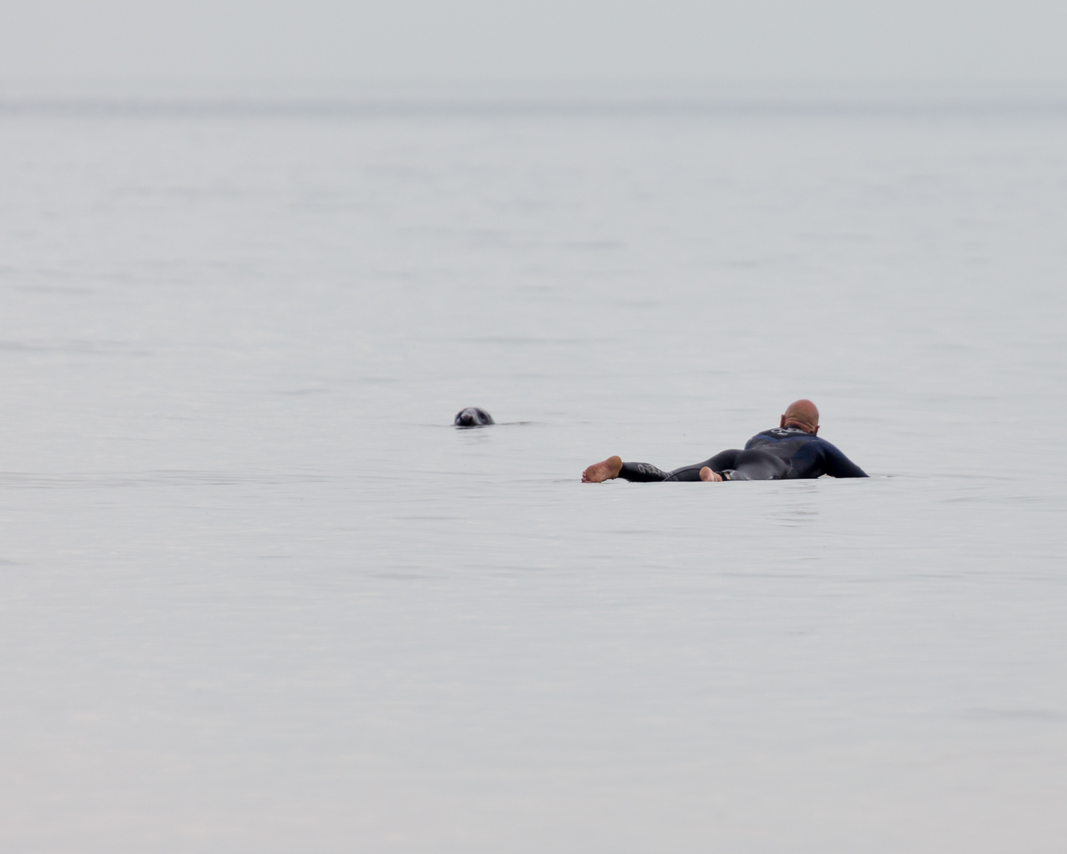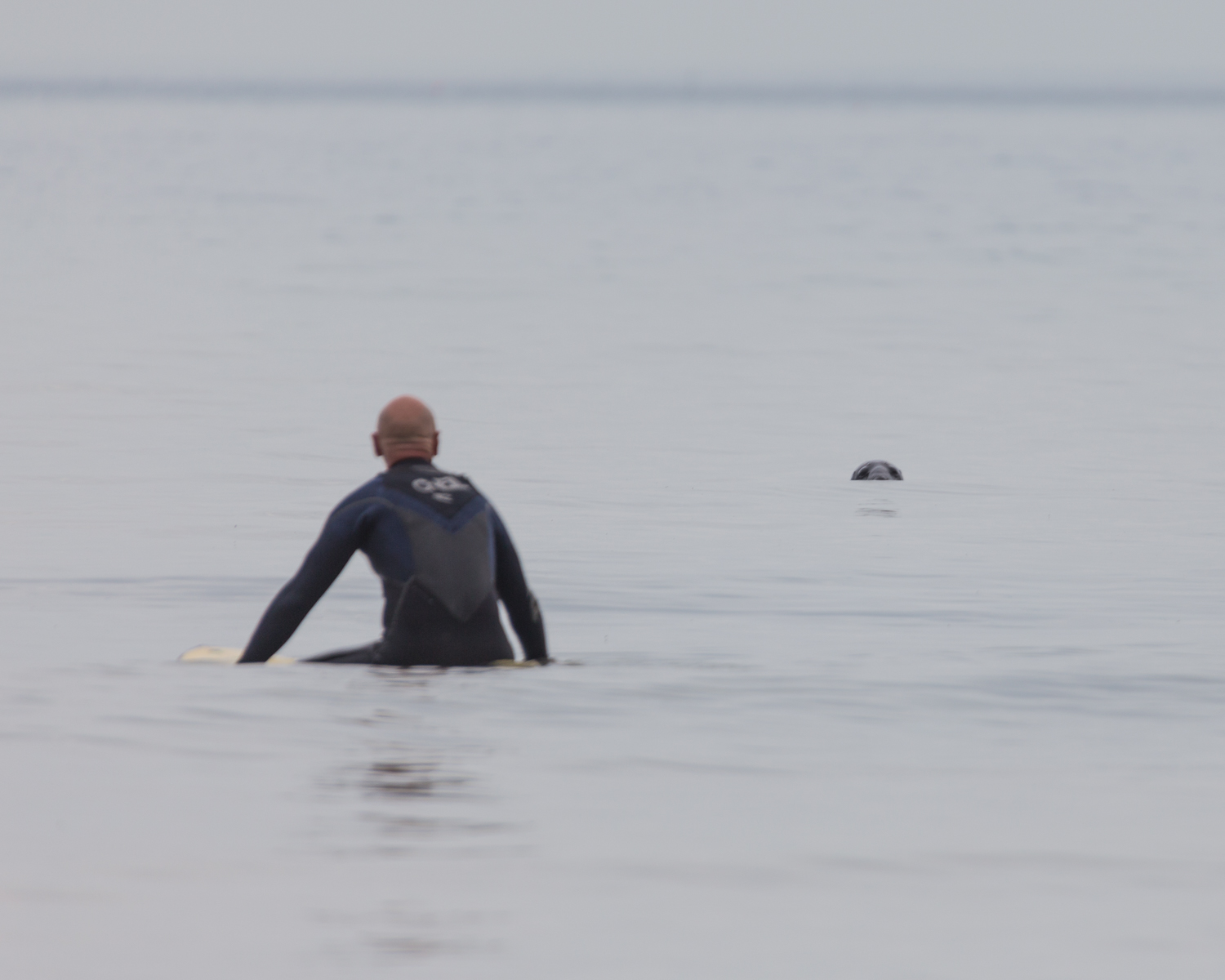 In the end it seems the seal was ok after all and was not tangled up in anything. It initially submerged and moved away when Paul got near (no closer than about 15ft away according to Paul), but then seemed calm and curious as it returned for a closer look at the two humans pretending to be seals. As a photographer I admit that I might have been hoping for a more exciting shoot, perhaps with a randy seal chasing Paul out of the water, but although that wasn’t to be, it was a happy ending of sorts, as the seal was fine and everyone went about their business. I later heard reports via facebook, that a seal fitting a similar description (bloody big head) had been spotted cruising the line up at Sandown when a few people were out enjoying a bit of easterly windswell.